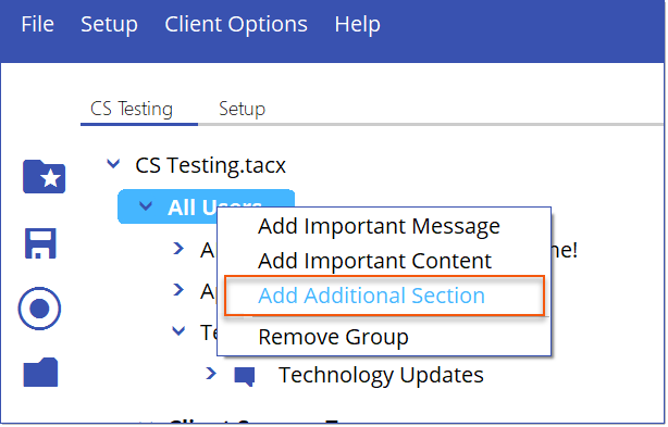 Users of Deliver Manager can create additional sections to organize content and messaging that displays on the Start Screen of Deliver Client. ![]() Deliver Client Start Screen Example 1.To add an extra section, right-click on a group name located on the left side of the Deliver Manager screen and choose Add Additional Section from the menu. a.Enter a title for the new Section. The title will be used for both the Section and the new Section Message, i.e. Technology Updates. b.Input a message that will be visible to users of Deliver Client when they choose the message within the new section of the Start menu. c.Click OK to save.