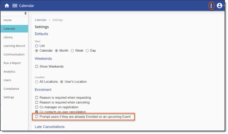 •New Calendar Configuration: Located in Calendar > 3 dot option > Settings “Prompt users if they are already Enrolled on an upcoming Event.” set to No by default.
