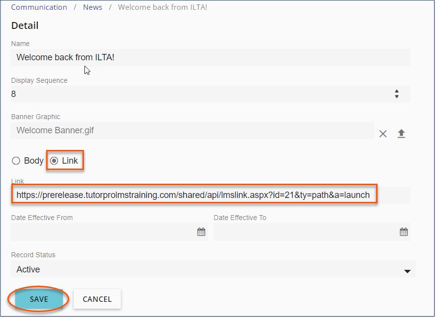 Consider adding one or more learner links to a News Banner or a free text dashboard card to highlight availability and offer speedy access. News Banner1.Copy a Course or Path Learner Link from the Library.